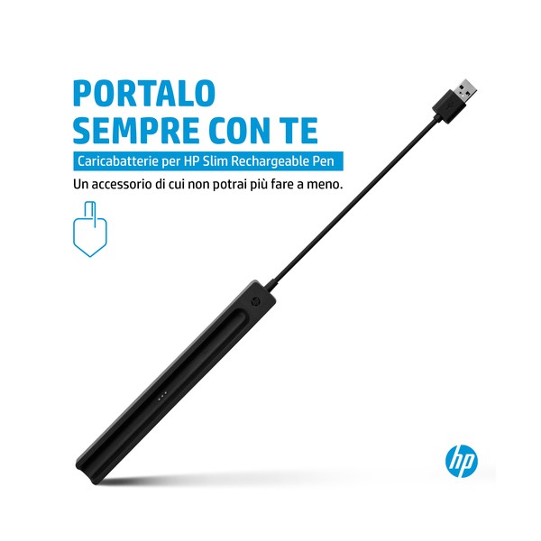 Ricarica via cavo USB semplificata Ricaricare la penna ricaricabile HP Slim [1] con il caricabatterie cablato USB di HP è facile e veloce. Basta posizionare la penna all'interno del caricabatterie e si allinea automaticamente al pogo-pin per la ricarica. Funziona anche in direzioni diverse. Inoltre, con l'apertura frontale, potete facilmente rimuovere la penna e caricarne un'altra.