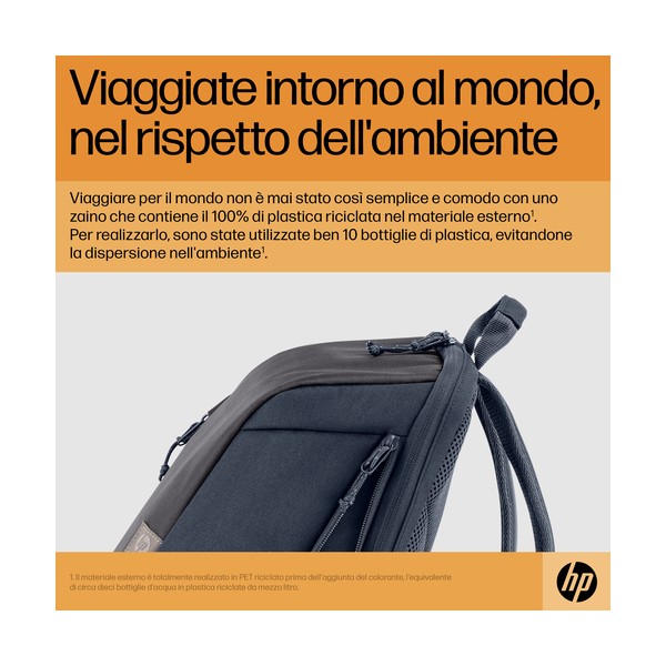 Viaggiare il tutto il mondo non è mai stato così facile, con uno zaino leggero che contiene il 100% di plastica riciclata nel materiale esterno[2]. Restate sereni sapendo che ci sono 10 bottiglie di plastica in meno nell'ambiente[2].
