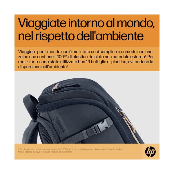 • Viaggiare per il mondo non è mai stato così comodo, con uno zaino leggero che contiene il 100% di plastica riciclata nei materiali esterni[2]. Rilassatevi, pensando che ci sono 13 bottiglie di plastica in meno a inquinare l'ambiente[2].