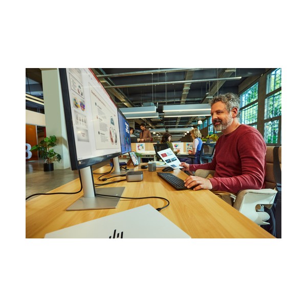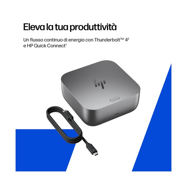 Questa dock inizia a funzionare prima ancora che vi sediate. HP Quick Connect[1] riattiva i dispositivi quando ci si avvicina, per non dover mai rallentare il ritmo. Tenete alta la produttività per tutta la giornata con un collegamento Thunderbolt™ 4 ad alta velocità[1] e le numerose porte per collegare i vostri dispositivi.