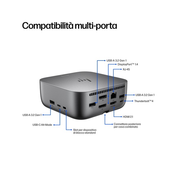 Un passo avanti Con HP Thunderbolt 4 100W G6 Dock potete lavorare in modo naturale. Concentratevi su ciò che conta grazie a una gestione automatica, alla connettività avanzata e all’alimentazione sempre pronta quando ne avete bisogno. Con una sicurezza allo stato dell’arte, per proteggere i vostri dispositivi.