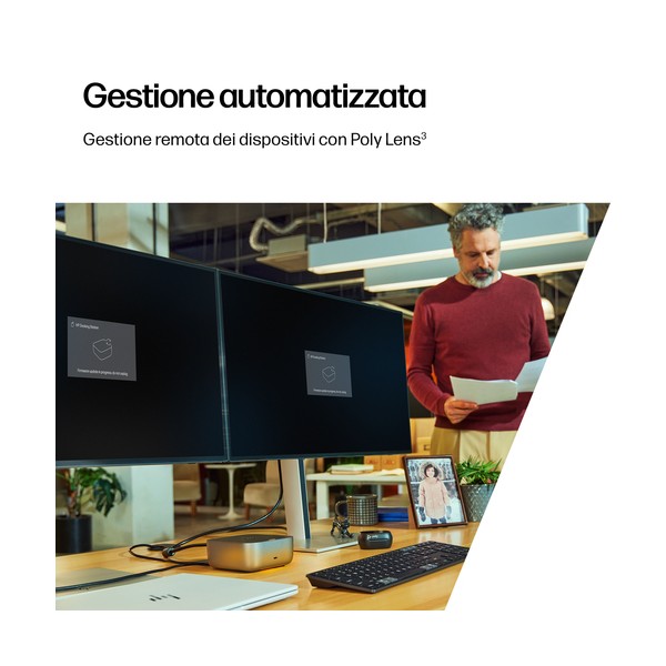 La gestione tramite cloud con Poly Lens[3] rende possibile il monitoraggio da remoto, ovunque vi troviate. Gestite gli aggiornamenti automatici del firmware in qualsiasi momento e monitorate facilmente dati di telemetria e analisi per ottimizzare gli spazi di lavoro e supportare gli utenti in modo efficace.