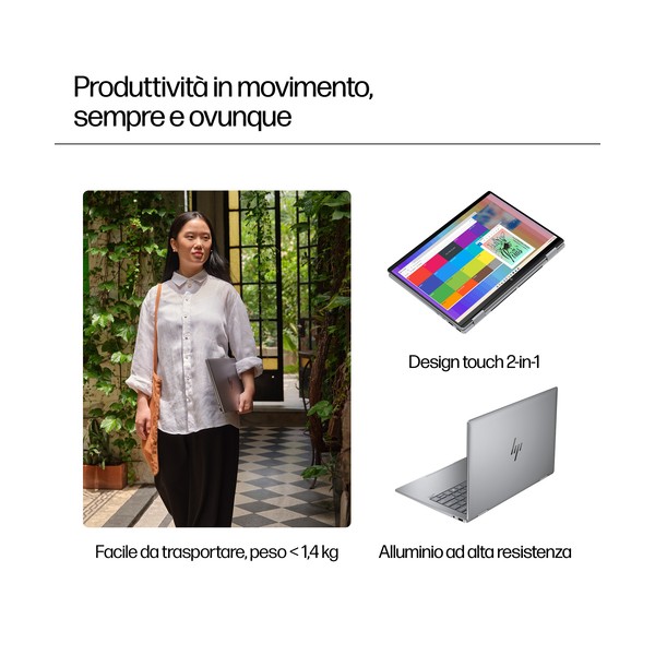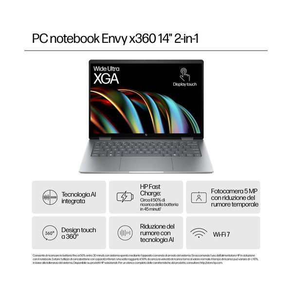 Un PC 2-in-1 basato su tecnologia AI per un multitasking fluido e naturale Con il più recente processore Intel®[1] e le sue avanzate funzioni AI, il laptop 2-in-1 HP Envy x360 da 14'' semplifica l'esecuzione delle applicazioni consentendoti di passare agevolmente da un'attività all'altra, ottimizzando al contempo la durata della batteria. Il suo design convertibile permette di alternare fra le modalità laptop e tablet con la massima facilità. Il PC HP Envy x360 è stato progettato per un impatto più sostenibile sul pianeta, con l'impiego di materiali riciclati.