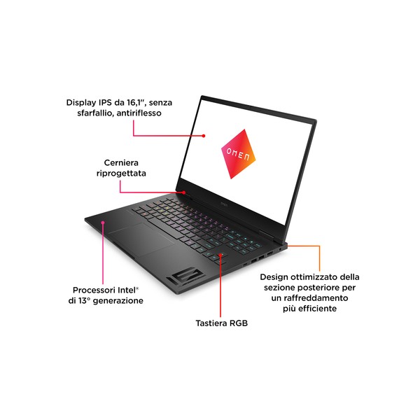 Divertimento assicurato ovunque. Il notebook gaming OMEN da 16" è pronto a seguirti ovunque. Potenza di livello desktop con un processore Intel® Core™ di 13° generazione[1] e una moderna scheda grafica NVIDIA®, entrambi controllati dalla tecnologia ottimizzata di raffreddamento interno. Anche lo schermo è eccezionale, con alta risoluzione, frame rate fluido e funzioni antiriflesso.
