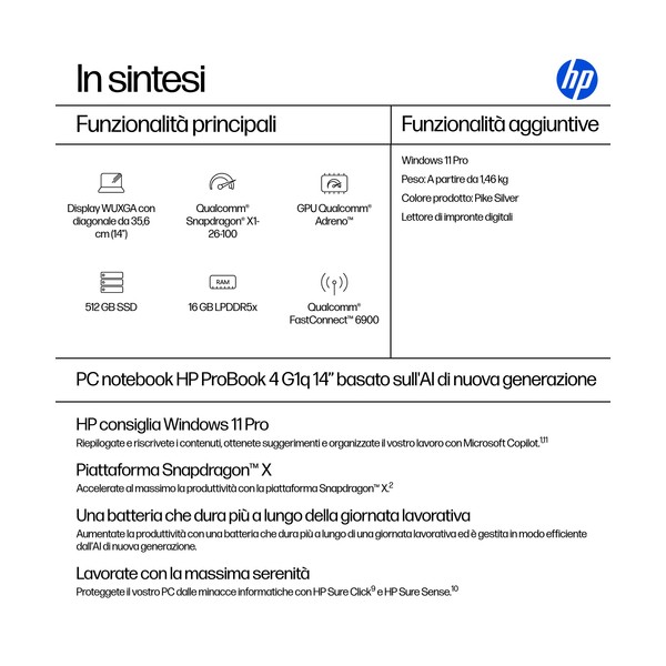 Potenziate il vostro business con le prestazioni AI di nuova generazione Portate la produttività a nuovi livelli con il PC HP ProBook 4 G1q 14'' basato sull'AI di nuova generazione. Grazie alla potenza della piattaforma Snapdragon™ X[2] con NPU fino a 45 TOPS[3], potete raccogliere rapidamente informazioni, semplificare le attività amministrative e collaborare in modo efficace grazie alla batteria a elevata autonomia di questo PC Copilot+.[7]