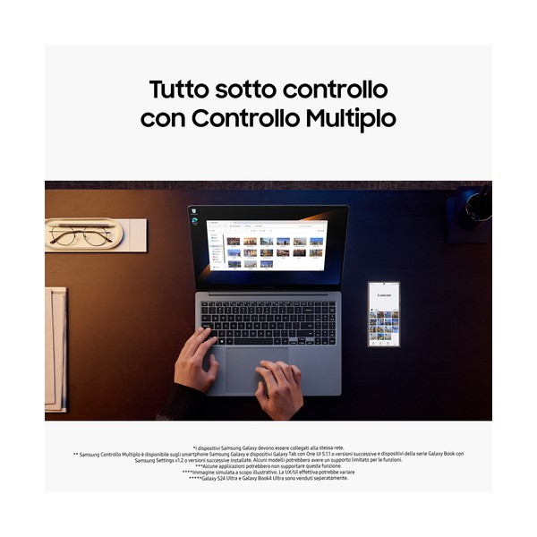Gestisci con flessibilità i tuoi progetti creativi su tutti i tuoi dispositivi con Controllo Multiplo. Usa la tastiera di Galaxy Book4 Ultra con un mouse per navigare attraverso i contenuti del tuo smartphone o Galaxy Tab. Trascina e rilascia o copia e incolla testo, immagini e file tra i dispositivi per raccogliere tutte le tue idee.