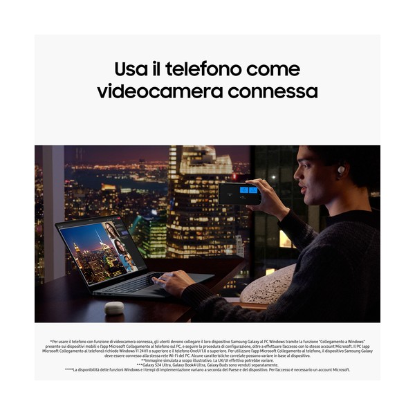 Potenzia le tue videochiamate passando dalla webcam del laptop alla nitidezza straordinaria della videocamera connessa del tuo smartphone Samsung Galaxy. Collegati facilmente al tuo Galaxy Book4 Ultra, passa dalla videocamera anteriore a quella posteriore per trovare langolazione giusta e goditi unimmagine di alta qualità con gli effetti potenziati delle applicazioni video.
