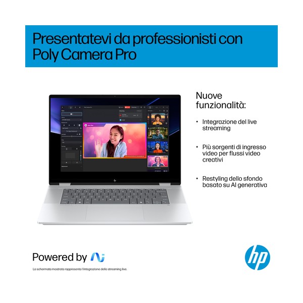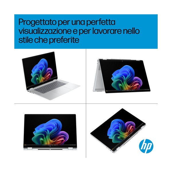 Espandi le tue potenzialità grazie all'intelligenza artificiale. Il PC HP OmniBook X Flip 16 AI di nuova generazione combina velocità e prestazioni per attività creative e intrattenimento. L'ampio display da 16" si adatta alle tue esigenze di visualizzazione (piatto, piegato o capovolto) e offre colori brillanti da qualsiasi angolazione. Progettato con un elegante chassis in metallo riciclato[1] e una tastiera retroilluminata con ampi tasti per un'esperienza d'uso ottimale.