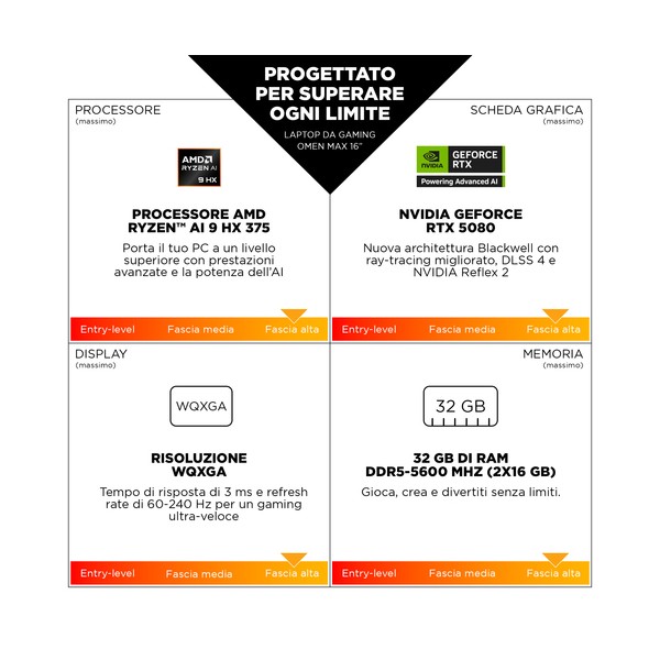 Progettato per superare ogni limite Il laptop da gaming OMEN 16 MAX offre prestazioni impareggiabili, a casa o in movimento. Con le GPU NVIDIA di nuova generazione e le CPU AMD Ryzen™[1], una nuova modalità Unleashed per l'overclocking manuale e un'architettura termica creata per ridurre sia il throttling che l'usura a lungo termine, i gamer appassionati potranno dare il meglio di sé per molti anni a venire.