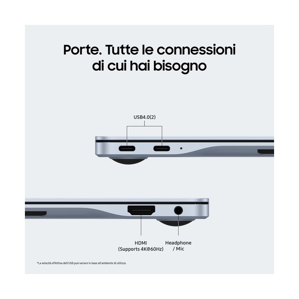 Porte integrate e versatili che ti consentono di collegare più dispositivi al tuo Galaxy Book4 Edge da 14", senza dongle e in maniera intuitiva. Potrai trasferire dati alla velocità della luce grazie a due porte USB 4.0 e collegarti con facilità tramite HDMI 2.1 (disponibile per contenuti a 60 Hz in 4K), e cuffie/microfono.