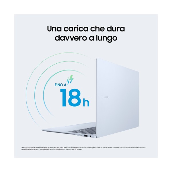 Al lavoro o fuori ufficio, la batteria di Galaxy Book4 Edge da 16" ha tutta la carica che ti serve, garantendo fino a 22 ore di autonomia video. Per una carica extra, usa la funzione Super Fast Charging per ricaricare fino al 40% in appena 30 minuti con il caricabatterie incluso.