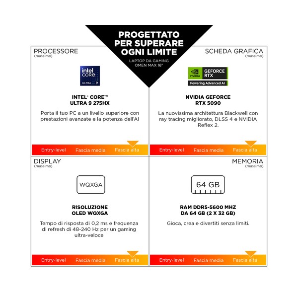 Progettato per superare ogni limite Il laptop da gaming OMEN 16 MAX offre prestazioni impareggiabili, a casa o in movimento. Con le GPU NVIDIA di nuova generazione e le CPU Intel Core™ Ultra[1], una nuova modalità Unleashed per l'overclocking manuale e un'architettura termica creata per ridurre sia il throttling che l'usura a lungo termine, i gamer appassionati potranno dare il meglio di sé per molti anni a venire.