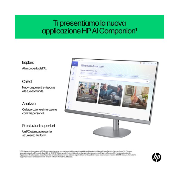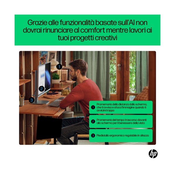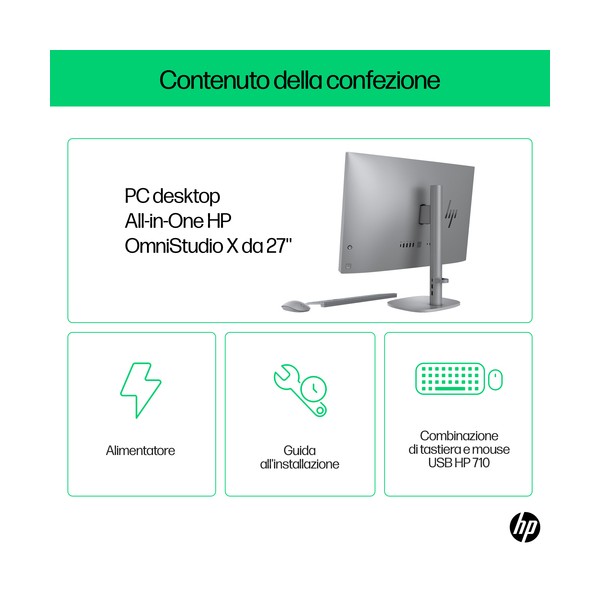 Affronta i compiti più impegnativi con un PC che lavora insieme a te. Affronta le attività più impegnative alla velocità della luce con il PC desktop All-in-One HP OmniStudio X 27'' dotato di tecnologia AI integrata e un potente processore Intel Core™ Ultra[1]. Immergiti in una qualità grafica straordinaria e lasciati avvolgere da un audio ricco e profondo, il tutto accompagnato da funzionalità AI per il comfort e il benessere.