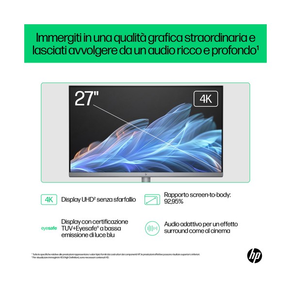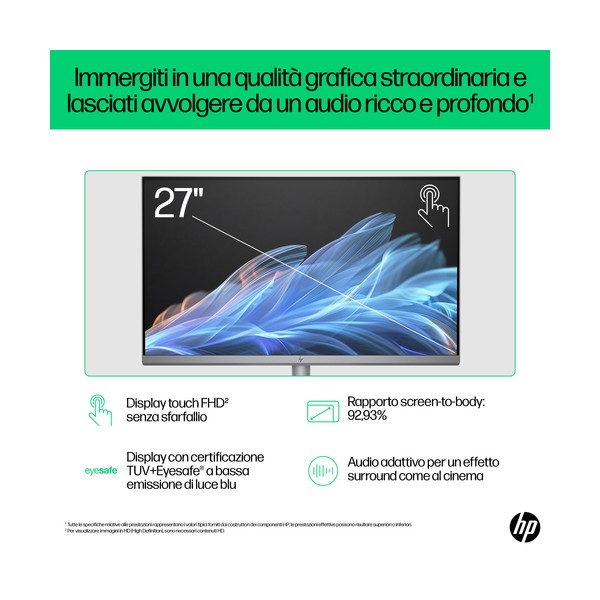 Diagonale da 68,6 cm (27"), FHD (1920 x 1080), IPS, micro-edge su tre lati, antiriflesso, 300 nit, 99% sRGB, 27" diagonal, FHD (1920 x 1080), IPS, three-sided micro-edge, anti-glare, 300 nits, 99% sRGB