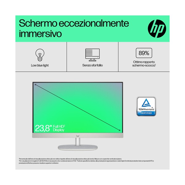 Diagonale da 60,5 cm (23,8"), FHD (1920 x 1080), IPS, micro-edge su tre lati, antiriflesso, 250 nit, 99% sRGB