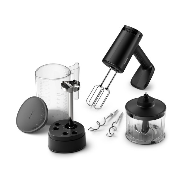 Mixer manuale da cucina 3 in 1 potente e versatile Design antischizzo a lunga portata Questo mixer 3 in 1 consente di mescolare o impastare anche impasti duri in pochi minuti. Riduce al minimo gli schizzi e i tempi di pulizia grazie al design a lunga portata e alla funzione Soft Start. Con accessori per frullatore e tritatutto e bicchiere Smart per la conservazione.