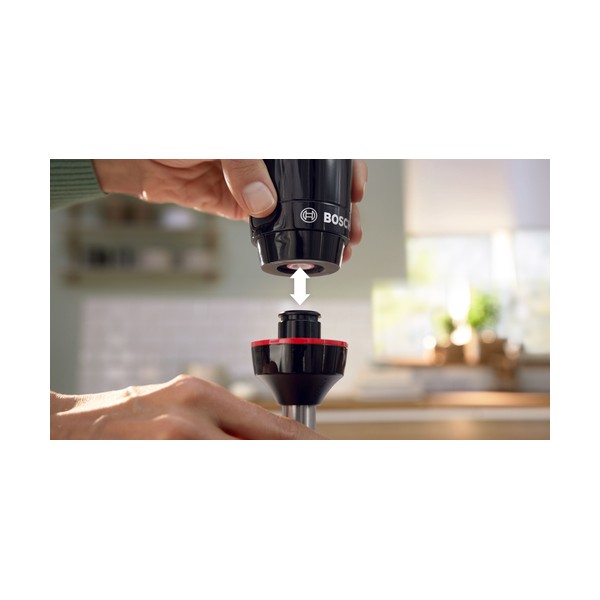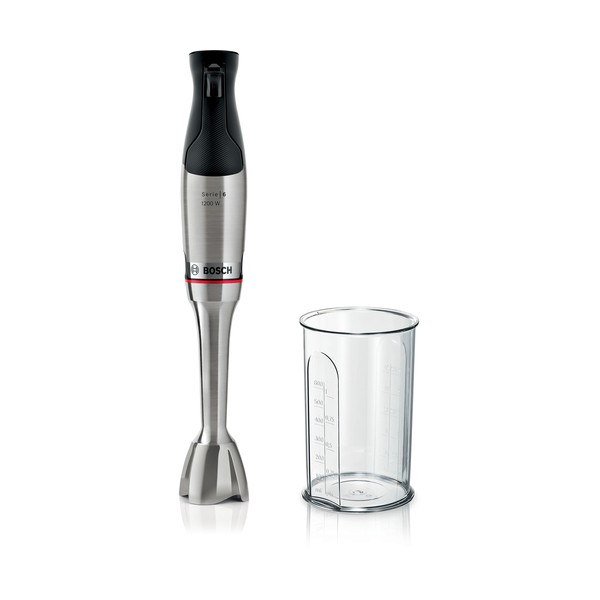 Bosch Serie 6 MSM6M810. Capacità ciotola: 0,6 L. Tipo: Frullatore ad immersione, Colore del prodotto: Stainless steel, Lunghezza cavo: 1,4 m. Potenza: 1200 W, Alimentazione: AC, Tensione di ingresso AC: 220-240 V. Larghezza: 395 mm, Profondità: 60 mm, Altezza: 78 mm. Pettini regolatori: 1 pz