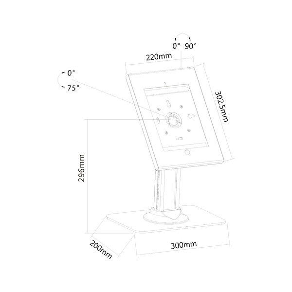 NewStar TABLET-D300WHITE è dotato di serratura e gira 75° di inclinazione liberamente e 90??° ruotano per angolo di visione multipla. Altezza: 30 cm. VESA: 75x75 mm. I cavi possono essere collocati attraverso la predisposizione di passaggio all’interno della colonna.