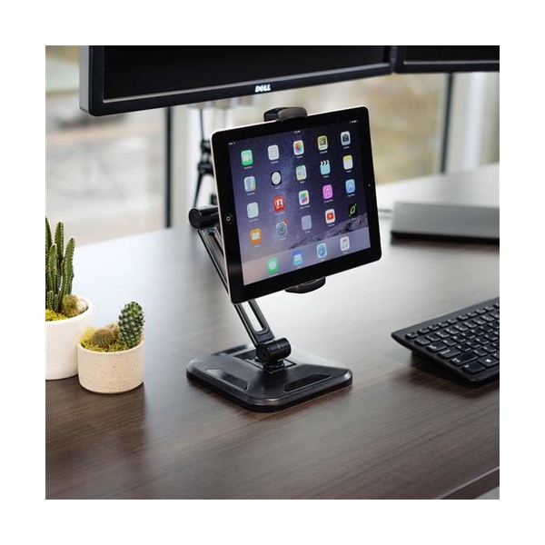 Il morsetto si allarga facilmente per adattarsi a tablet e telefoni di dimensioni da 4,7" a 12,9" fino a un 1 kg di peso. Grazie all'ampia base, il tablet resta fissato in modo sicuro alla scrivania, ripiano o qualsiasi altra superficie piana. È inclusa anche una base più piccola per montare il supporto per tablet a parete, o sulla superficie inferiore di un armadio o di un pensile da cucina, per un'ampia gamma di applicazioni.