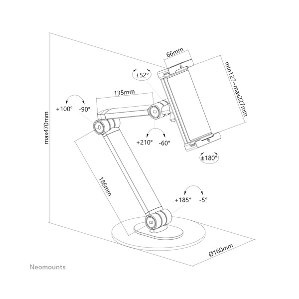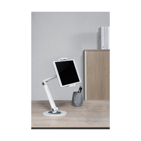 Il Neomounts by Newstar DS15-550WH1 è un supporto per tablet universale per tablet da 4,7" fino a 12,9" con una capacità di carico di 1 kg. Il supporto per tablet ha 3 punti di rotazione ed è ideale per videochiamate in vivavoce, guardare un film o giocare. Il giunto sferico integrato consente al supporto di ruotare di 360° in modo da poter passare dalla posizione verticale a quella orizzontale. Inoltre, le intelligenti opzioni di inclinazione (270°) e rotazione (104°) consentono al supporto di cambiare ulteriormente l'angolo di visione ideale. I cuscinetti in gomma morbida proteggono il tuo dispositivo da eventuali graffi e la solida base con cuscinetti in silicone antiscivolo assicurano un appoggio solido del dispositivo.