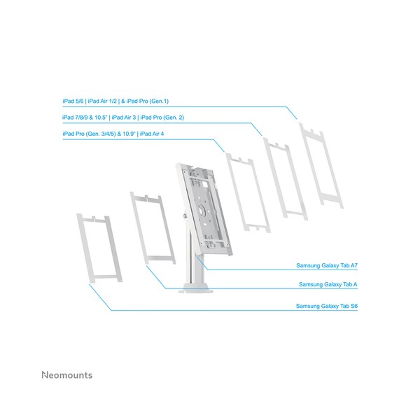 Il Neomounts by Newstar DS15-640WH1 è un supporto per tablet da tavolo che può ruotare di 90° in modo da poter passare dall'orientamento verticale a quello orizzontale. Il supporto può inclinarsi fino a 75° per una comoda posizione di visualizzazione. Il design intelligente include sei diversi inserti per tablet, rendendo il supporto per tablet adatto alla maggior parte dei tablet da 9,7-11", incluso iPad Pro gen 1-5, iPad Air 1-4, iPad 5-9, Samsung Galaxy Tab A, Tab A7 e Tab S6. Il supporto per tablet è dotato di un lucchetto antifurto e di una base avvitabile per una maggiore sicurezza. I cuscinetti antiscivolo nella custodia proteggono il tablet da possibili graffi e la struttura in acciaio garantisce un posizionamento sicuro e stabile. Il sistema di gestione dei cavi consente di guidare i cavi attraverso l'involucro.