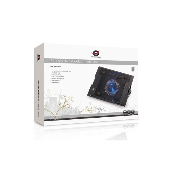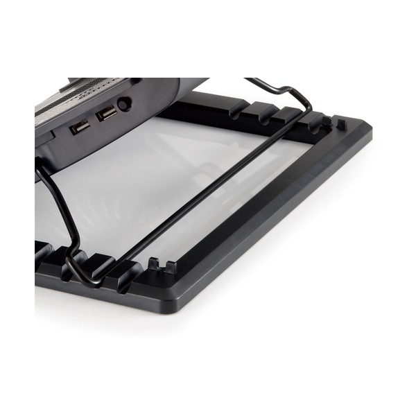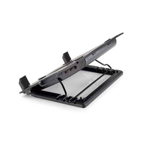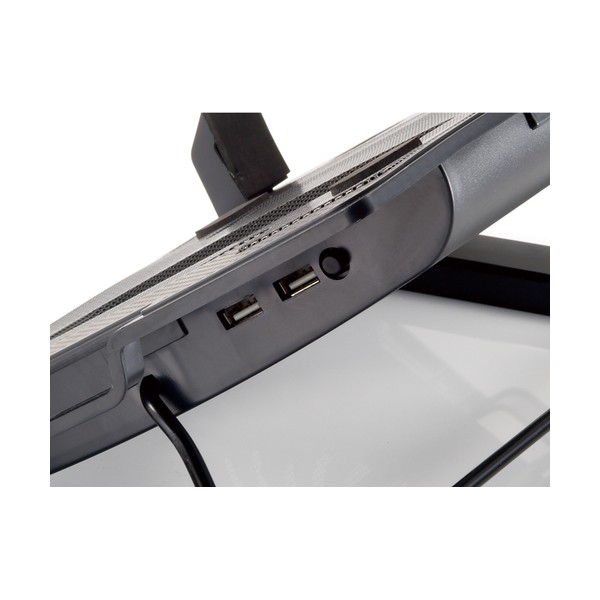 - Compatibile con notebook fino a 17" - Hub USB con 1 porta - Supporto con cinque angolazioni - Ventola silenziosa da 14 cm integrata - Piedini rimovibili antiscivolo - Fermacavi USB - Alimentazione USB