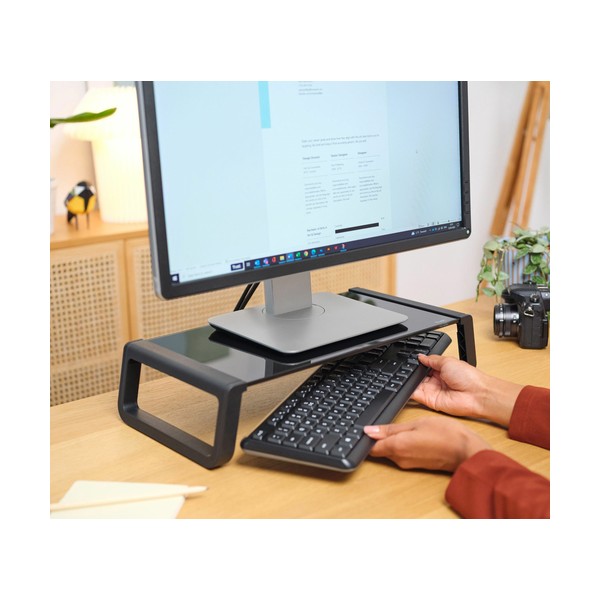Scrivania più sgombra, mente più sgombra Rialzando il tuo laptop o il tuo monitor, questo stand ti offre un livello extra di spazio nella parte inferiore per riporre facilmente la tua tastiera o altri accessori. Lavoro più comodo e organizzato, arriviamo!