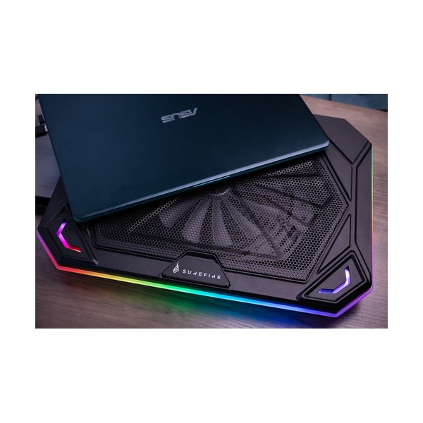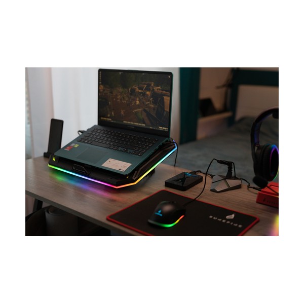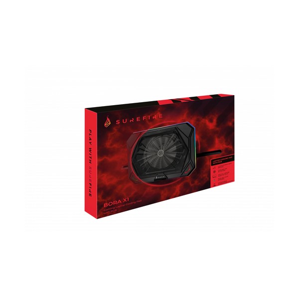 SureFire Bora X1. Capienza massima dimensioni dello schermo: 43,2 cm (17"), Numero di ventilatori già presenti: 1 pz, Diametro del ventilatore: 20 cm. Colore del prodotto: Nero, Materiali: Metallo, Plastica, colore d'illuminazione: Blu, Verde, Rosso. Interfaccia host: USB. Tipologia alimentazione: dC, Voltaggio di ingresso: 5 V, Consumo corrente: 1100 mA. Larghezza: 428 mm, Profondità: 318 mm, Altezza: 54 mm