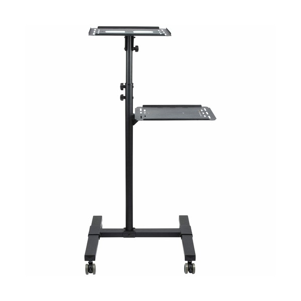 Carrello per proiettore portatile con vassoio per laptop | Altezza regolabile | Gestione dei caviQuesto supporto per proiettore e computer laptop completamente in acciaio consente di configurare una postazione multimediale mobile facilmente spostabile tra aule, sale riunioni e sale conferenze. Dispone di due piattaforme per dispositivi in grado di sostenere ciascuna un carico di 10 kg ed è dotato di resistenti rotelle (2 bloccabili) che agevolano il trasporto.Flessibilità di configurazioneGrazie ai due vassoi integrati, questo carrello per proiettore consente di scegliere dove montare il proiettore, il computer laptop e gli altri dispositivi multimediali in base alle esigenze. Entrambi i vassoi sono dotati di cornici di sicurezza che impediscono lo scivolamento delle apparecchiature.Il vassoio superiore presenta una superficie di 35 cm x 30 cm per il posizionamento di un computer laptop o di un proiettore a seconda delle esigenze. È possibile regolarne l'altezza (da 95 cm a 145 cm dal pavimento) e l'angolo di inclinazione (+/-12°) per una migliore esperienza di visione in base alle esigenze di presentazione. Le regolazioni possono essere effettuate manualmente tramite le apposite manopole.Situato a 68,5 cm di altezza, il vassoio inferiore presenta una superficie di 36,3 cm x 30.Sicurezza e stabilitàCon un'area base di 45,4 cm x 50 cm, questo supporto è in grado di sostenere comodamente un carico combinato di 20 kg. Per una maggiore sicurezza, è possibile fissare i dispositivi in posizione facendo passare delle cinghie attraverso le sottili aperture del vassoio superiore e del vassoio inferiore (cinghie non incluse). Inoltre, questo carrello è dotato di 2 morsetti di gestione cavi che consentono di disporre i cavi lungo l'asta in modo ordinato e sicuro, oltre a facilitare il trasporto della postazione.Il prodotto ADJPROJCART è coperto da una garanzia StarTech.com di 5 anni e dal supporto tecnico gratuito a vita.The StarTech.com Advantage