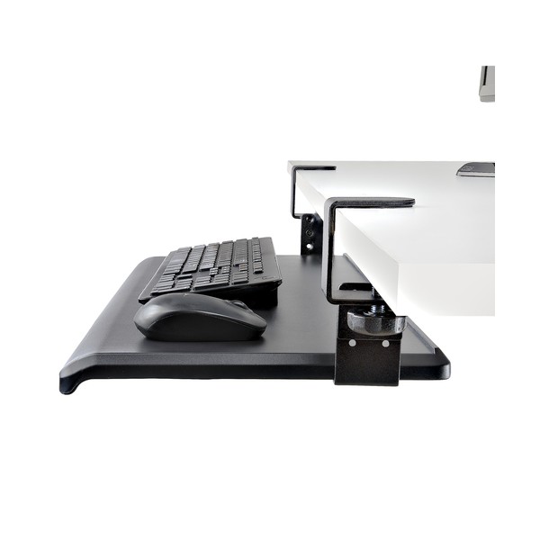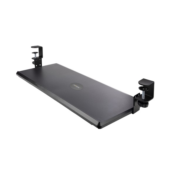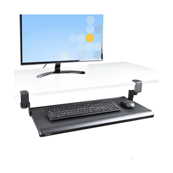 Vassoio per tastiera sotto-scrivania | 3 opzioni di altezza | Fino a 12 KgQuesto vassoio per tastiera da installare sotto la scrivania aggiunge comodità e comfort alla configurazione, consentendo di recuperare spazio prezioso sulla scrivania. Il bordo curvo del vassoio per tastiera è progettato ergonomicamente per il comfort.Design Ampio e RobustoL'ampia superficie del vassoio per tastiera, che misura 700 x 310 mm, fornisce spazio sufficiente per una tastiera full-size, un mouse e un poggiapolsi. Inoltre, il vassoio ha una portata di 12 kg che garantisce una base stabile per la digitazione e può estendersi fino a 216 mm dal bordo della scrivania.Semplice da Installare ed UtilizzareIl vassoio per tastiera è dotato di guide che gli permettono di scorrere avanti e indietro sotto la scrivania senza problemi. Una volta assemblati, i morsetti per scrivania sono installati a mano e sono adatti a scrivanie con uno spessore fino a 58,4 mm. I cuscinetti antiscivolo forniscono un solido fissaggio alla scrivania mentre ne proteggono la superficie. Si può eegolare l'altezza del vassoio su una delle tre impostazioni disponibili: 100, 120 o 140 mm. Una delle tre impostazioni garantirà la giusta distanza tra l'utilizzatore e il vassoio, fornendo l'altezza ideale per uno spazio di lavoro ergonomico. I morsetti da scrivania occupano uno spazio minimo, solo 47 x 64 mm ognuno.The StarTech.com Advantage