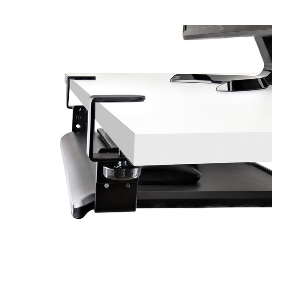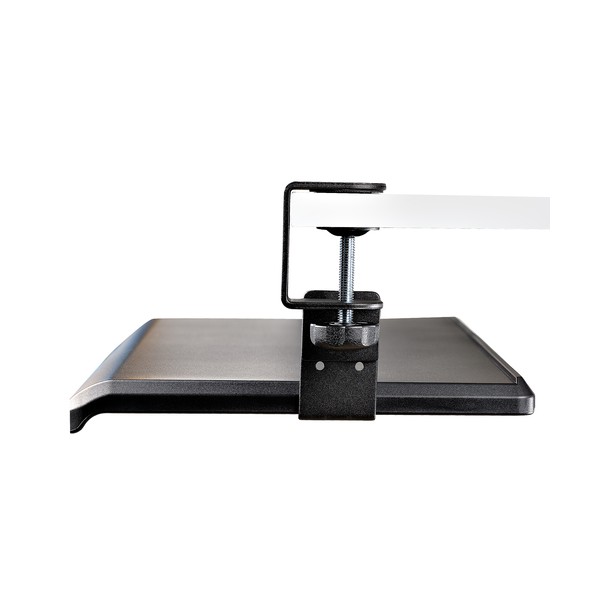 FACILE DA INSTALLARE: Dopo il montaggio, il vassoio della tastiera è saldamente fissato al tavolo stringendo i morsetti a mano. I morsetti sono dotati di cuscinetti antiscivolo e occupano pochissimo spazio (47x64 mm). Per tavoli fino a 58,4 mm di spessore