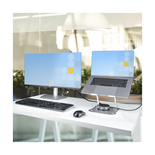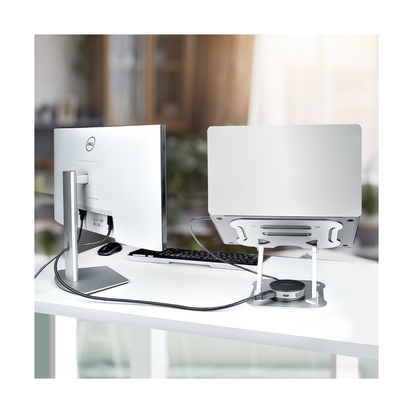 DESIGN COMPATTO: La solida base misura solo 19,9 x 21,4 cm, è dotata di cuscinetti antiscivolo per mantenere il supporto salvaspazio per laptop in posizione e proteggere la scrivania - Leggero (714g) e pieghevole, può essere riposto nella borsa per laptop