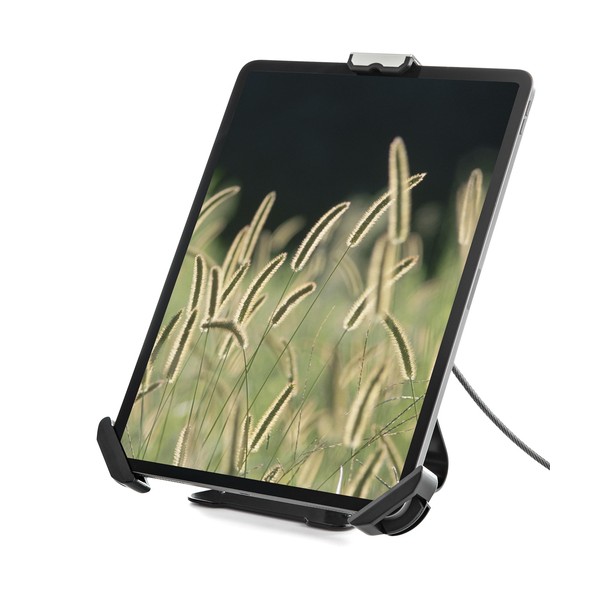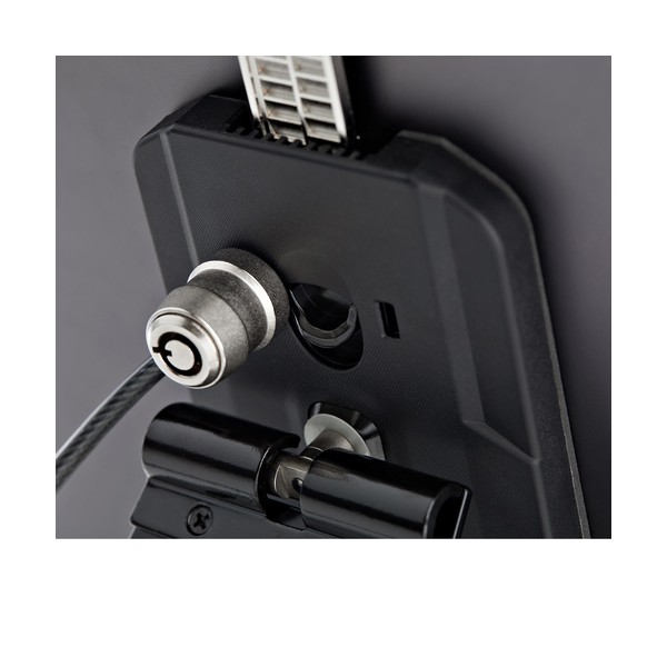 MAGGIORE SICUREZZA: le staffe di blocco assicurano il tablet in posizione; per una maggiore sicurezza, è possibile avvitare la base alla scrivania (viti incluse); 2 K-slot di tipo Kensington e 1 cavo di sicurezza da 1,8 m (2 chiavi incluse)
