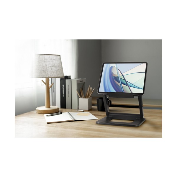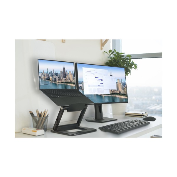 Migliora il tuo spazio di lavoro con il supporto per laptop pluriangolare regolabile EQ SmartFit™, specificamente progettato per scrivanie compatte e configurazioni a più monitor, utilizzando un laptop come uno dei display. Offre sei combinazioni di altezze personalizzabili e angolo, per supportare angoli di visualizzazione ergonomici appropriati e utilizza connettori a doppio blocco per garantire stabilità e semplificare le regolazioni. Consigliato dal German IGR Institute for Health and Ergonomics, la sua struttura resistente supporta laptop e MacBook da 13 a 16. I piedini in gomma antiscivolo garantiscono che il tuo dispositivo e la base rimangano stabili. Un prodotto resistente, questa base è realizzata in plastica resistente, di elevata qualità, contenente il 75% di contenuti riciclati post-consumo. Ideale per piccoli spazi di lavoro, utilizza uno spazio minimo sulla scrivania e si ripiega comodamente quando non è in uso. Spedito in un imballaggio certificato FSC®, include una garanzia limitata di 2 anni.