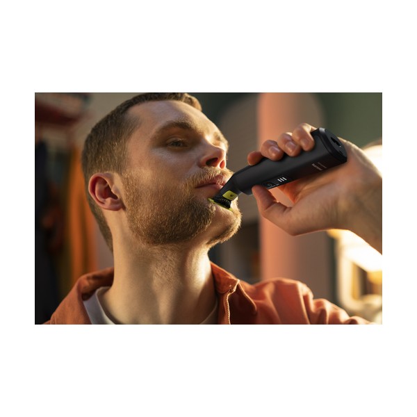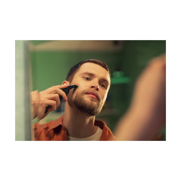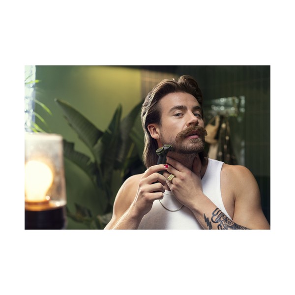Regolazione perfetta Puoi regolare la tua barba ad una lunghezza uniforme con il pettine di precisione incluso. Scegli una delle 14 impostazioni di lunghezza per ottenere lo stile che desideri, da una barba di 1 giorno fino a una barba effetto incolto.