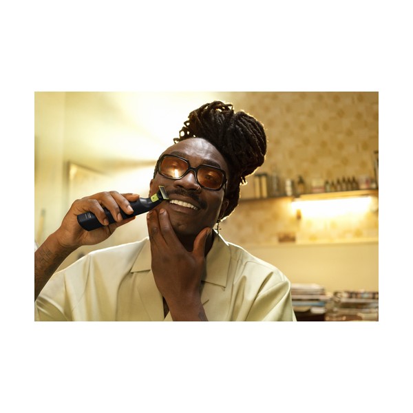 Rasatura confortevole OneBlade non rade in profondità come una lama tradizionale, così si prende cura della tua pelle. Usalo contropelo per radere facilmente la barba di qualsiasi lunghezza su viso e corpo. Include due lame: una per il viso e una per il corpo.