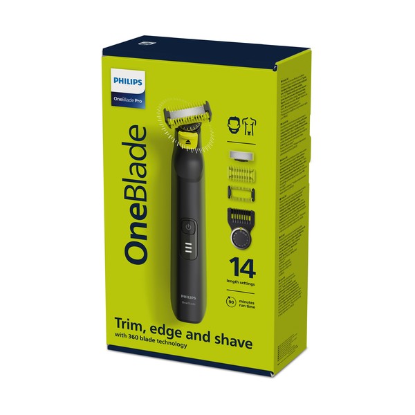 Rade, regola e rifinisce senza sforzo peli a qualunque lunghezza Il nuovo OneBlade Pro 360 rade, regola e rifinisce i peli di qualsiasi lunghezza, con maggiore facilità. Dimenticate di utilizzare più passaggi e strumenti. OneBlade fa tutto.