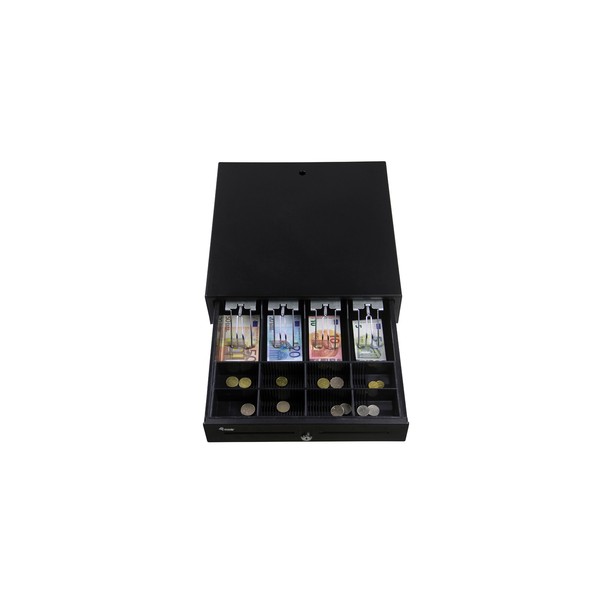 Equip 351010. Tipo di prodotto: Cassetto di cassa manuale, Materiale della scocca: Metallo, Colore del prodotto: Nero. Larghezza: 420 mm, Profondità: 405 mm, Altezza: 110 mm. Numero di tasti inclusi: 2 pz. Quantità per cartone principale: 1 pz, Peso del cartone principale: 6,5 kg, Lunghezza del cartone principale: 450 mm