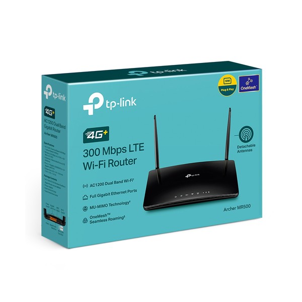 TP-Link Archer MR500. Tipo di connessione WAN: RJ-45. Banda Wi-Fi: Dual-band (2.4 GHz/5 GHz), Wi-Fi standard: Wi-Fi 5 (802.11ac), Intervallo di trasferimento dei dati WLAN (max): 867 Mbit/s. Tipo di interfaccia LAN Ethernet: Gigabit Ethernet, Velocità trasferimento Ethernet LAN: 10,100,1000 Mbit/s, Standard di rete: IEEE 802.11a, IEEE 802.11ac, IEEE 802.11b, IEEE 802.11g, IEEE 802.11n. Generazione di reti mobili: 4G, Standard 3G: DC-HSPA+, HSPA, UMTS, Standard 4G: LTE-FDD. Algoritmi di sicurezza supportati: 64-bit WEP, 128-bit WEP, WPA, WPA-Enterprise, WPA2, WPA2-Enterprise