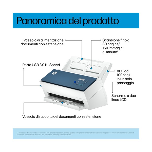 Due modalità di scansione (solo fronte e fronte/retro) sul pannello frontale per scansione HP in Win OS, HP Easy Scan/ICA in Mac OS e applicazioni di terzi tramite TWAIN, ISIS e WIA