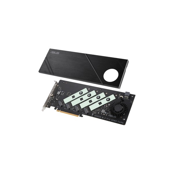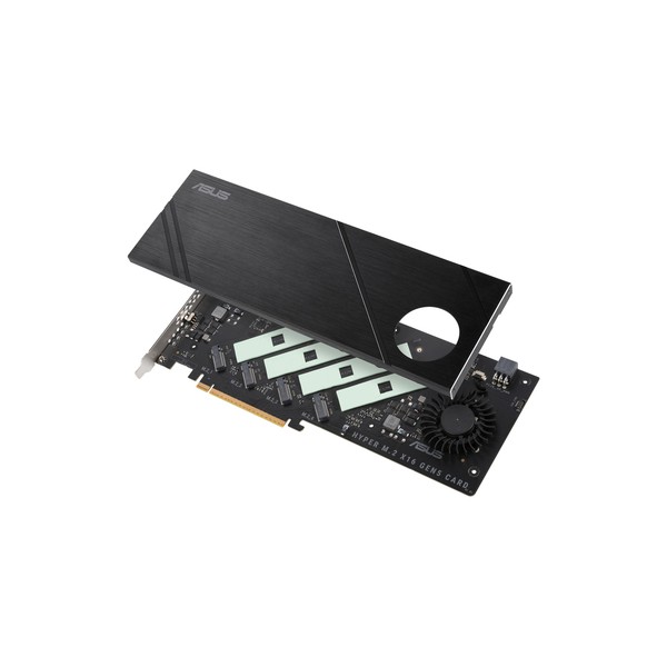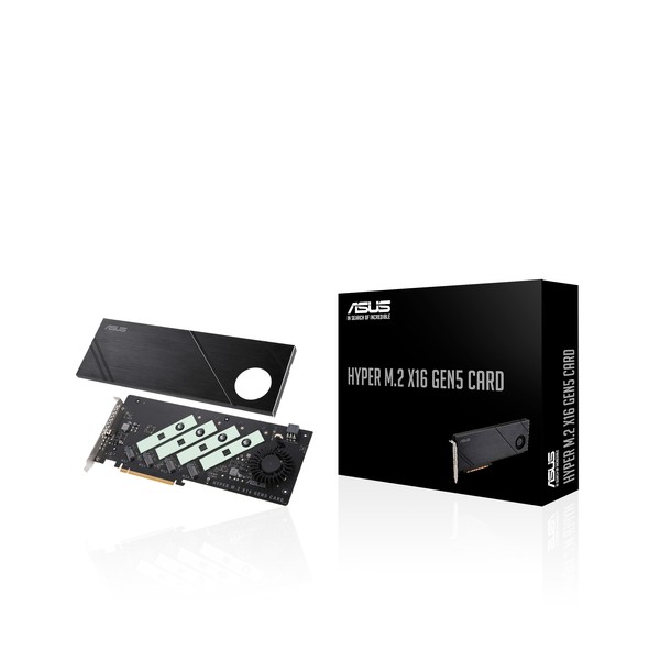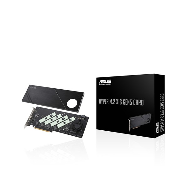 ASUS Hyper M.2 x16 Gen5 Card. Interfaccia host: PCIe, Interfaccia di uscita: M.2, Scheda di espansione standard: PCIe 5.0. Colore del prodotto: Nero, Utilizzo: PC, Tipo di raffreddamento: Attivo. Velocità massima di trasmissione: 512 Gbit/s. Larghezza: 290 mm, Profondità: 122 mm, Altezza: 15 mm. Quantità per pacco: 1 pz
