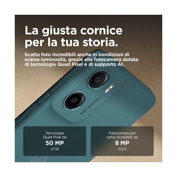 Foto più nitide per storie straordinarie. Goditi immagini e audio mozzafiato con il nuovo Moto g05. Guarda i tuoi spettacoli e film preferiti su uno schermo sorprendentemente luminoso da 6,67" anche all'aperto sotto la luce del sole. E ascolta un audio avvolgente grazie ai potenti altoparlanti stereo con Amplificazione bassi. Scatta foto straordinariamente nitide sia di giorno che di notte con il sistema di fotocamera Quad Pixel da 50 MP(2) dotato di funzionalità Ritratto basata sull'AI. Incrementa la tua velocità con performance ultra-efficienti e fino a 12 GB di RAM disponibili con Estensione RAM(5). Grazie a una finitura in materiale premium vegano(4) e a Corning® Gorilla® Glass 3, Moto g05 regala uno stile intramontabile. Conta sulla straordinaria autonomia offerta dalla batteria da 5200 mAh e sulla ricarica TurboPower™. E ottieni tantissimo spazio di archiviazione per conservare i tuoi contenuti e le tue creazioni. Moto g05 è sorprendente sotto ogni aspetto.