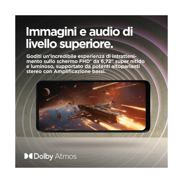 Schermo e audio di livello superiore. Dai vita all'intrattenimento con uno schermo FHD+ da 6,72” sorprendentemente nitido e luminoso supportato da potenti altoparlanti stereo con Amplificazione bassi