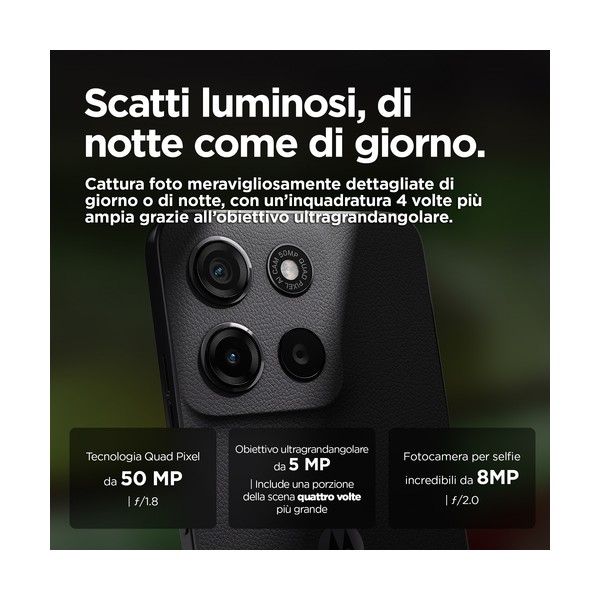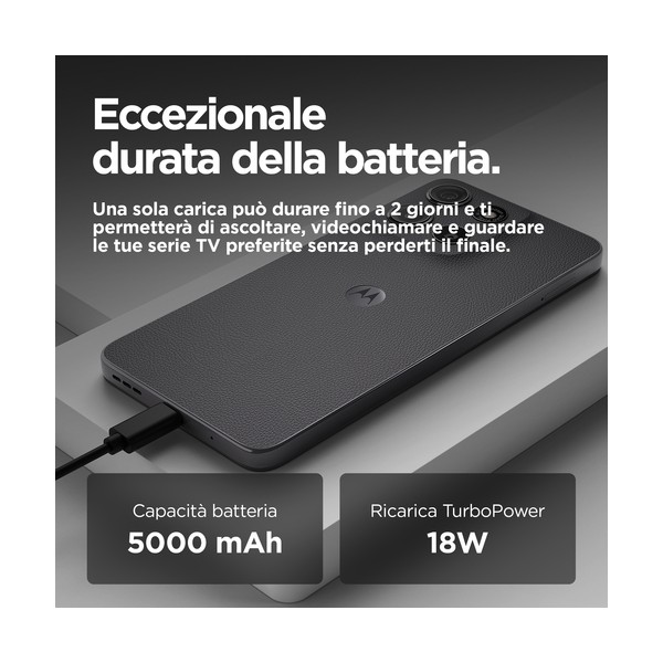 Più grande. Più audace. Più luminoso. Moto g15 ti offre il meglio dell'intrattenimento cinematografico. Guarda i tuoi spettacoli e film preferiti su uno schermo Full HD+ da 6,72” sorprendentemente nitido e luminoso, anche all'aperto sotto la luce del sole. Ascolta un audio avvolgente grazie ai potenti altoparlanti stereo con Amplificazione bassi e Dolby Atmos®. Scatta foto straordinariamente dettagliate con il comparto fotografico da 50 MP(1) che elimina gli effetti fastidiosi causati dalle sorgenti di luce artificiali. Ricarica velocemente con la ricarica TurboPower™(2) e approfitta di un'autonomia maggiore con la batteria da 5200 mAh. Goditi il look raffinato del materiale premium vegano e la protezione offerta dal design idrorepellente(3) e da Corning® Gorilla® Glass 3. Inoltre, grazie alle prestazioni ultra rapide e all'ampia memoria di archiviazione, avrai sempre spazio per il divertimento. Illumina ogni giornata con Moto g15.