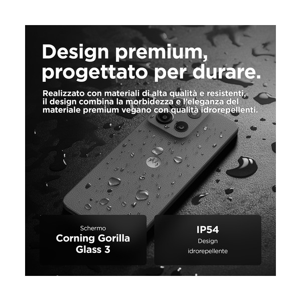 Design elegante ma resistente. Goditi il look raffinato del materiale premium vegano in un design idrorepellente3 con Corning® Gorilla® Glass 3