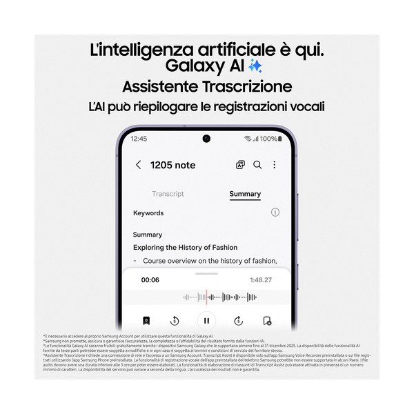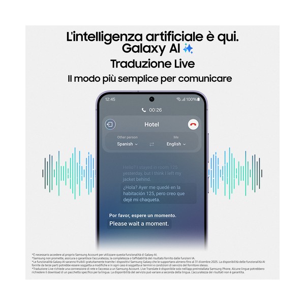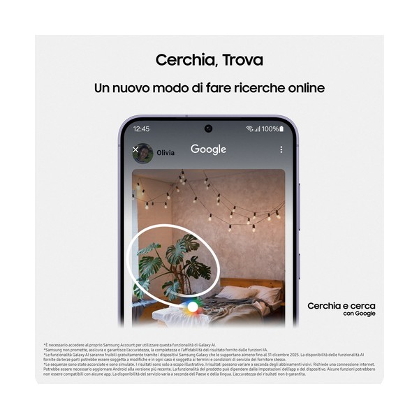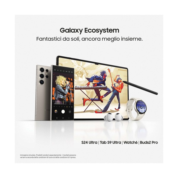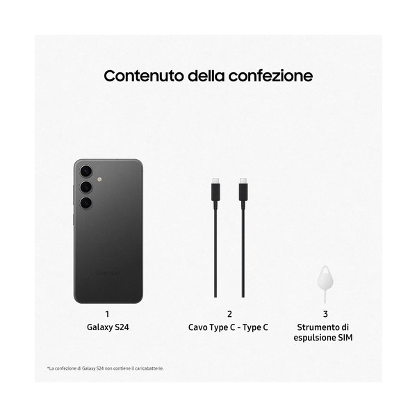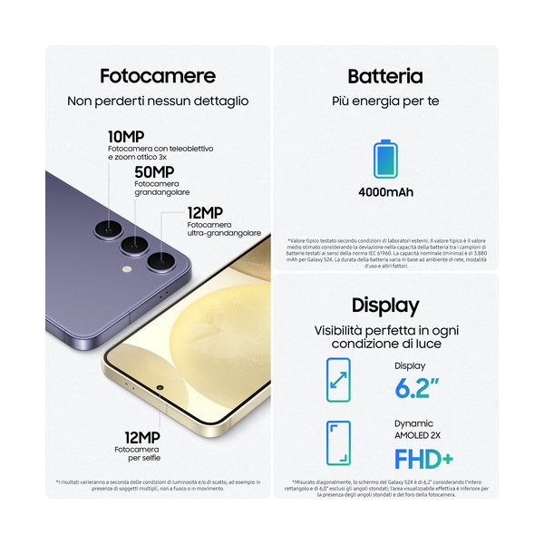 L'intelligenza artificiale è qui. Galaxy AI. Prova un’esperienza di ricerca online mai vista prima con Cerchia e cerca1, ottieni una traduzione in tempo reale di una chiamata2, riassumi i tuoi appunti e riorganizzali in modo chiaro3 e modifica le tue foto da professionista4- tutto con l'AI. Grazie alle dimensioni più grandi del display e alle cornici ultrasottili5, il display FHD+ da 6,2""6 di Galaxy S24 ti offre un'esperienza di visione totalmente immersiva. Scatta foto straordinarie con dettagli definiti, a più livelli di zoom e cogli ogni dettaglio grazie alla nuova soluzione AI Zoom.7 ll nuovo Armor Aluminum migliorato mantiene protetto il tuo smartphone8 e con la certificazione IP689 per la resistenza all’acqua e alla polvere, Galaxy S24 è protetto anche durante le tue avventure più selvagge. Non farti fermare durante la giornata grazie alla batteria intelligente ad autonomia elevata.10
