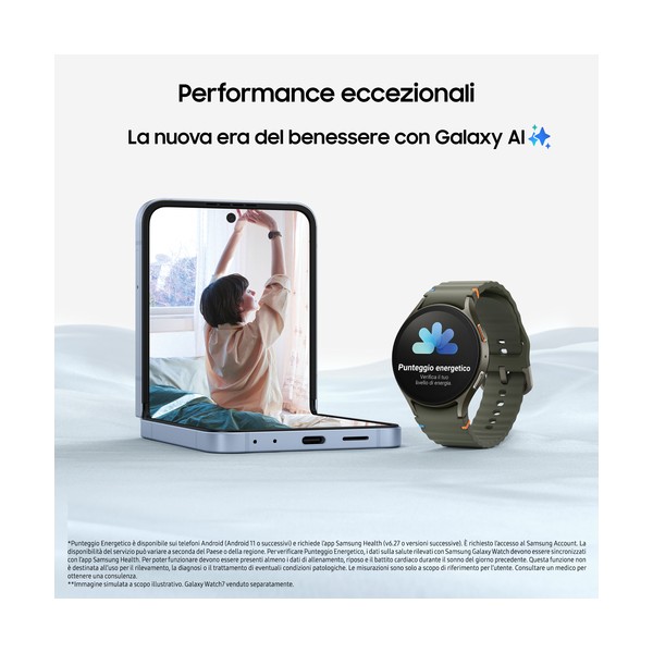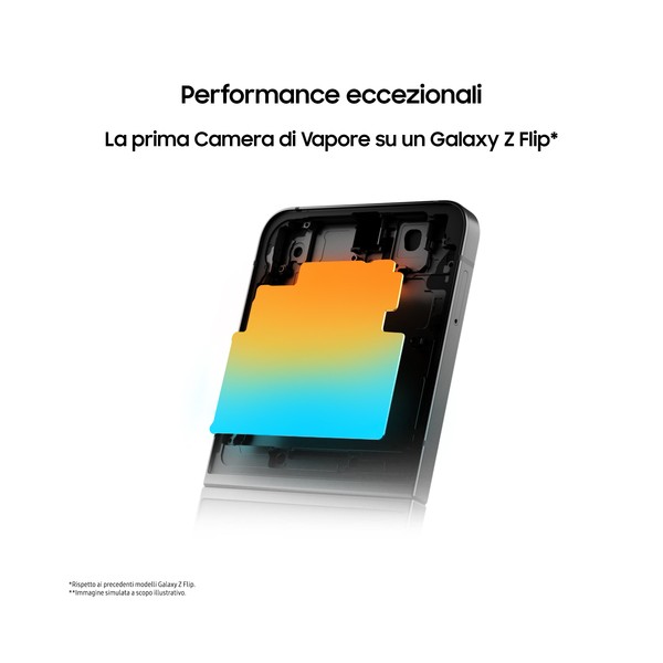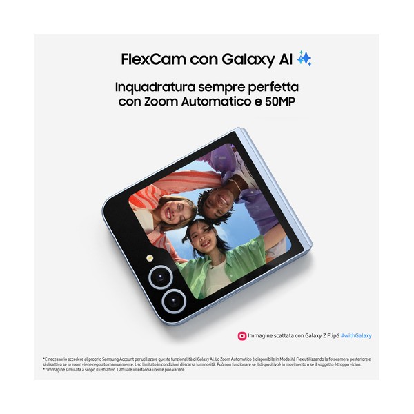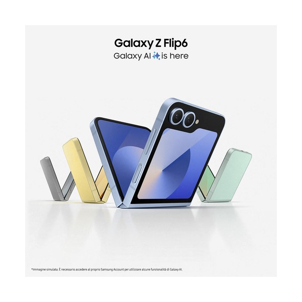Scopri Galaxy Z Flip6, lo smartphone Galaxy pieghevole compatto dotato di fotocamera da 50 MP e batteria a lunga durata, potenziato dalle innovative funzionalità di Galaxy AI. Abbatti le bariere linguistiche in un attimo grazie a Interprete su FlexWindow: Galaxy AI trascrive le conversazioni in tempo reale e le traduzioni in lingua appaiono come testi sul display esterno del tuo Galaxy Z Flip6. Scopri la nuova fotocamera professionale da 50MP con Galaxy AI, pronta a scattare foto straordinarie. Realizza anche selfie fantastici a mani libere con FlexCam grazie allo Zoom Automatico che regola l'inquadratura e riprende tutti i soggetti.1 La batteria più grande di sempre su un Galaxy Z Flip, abbinata a Snapdragon® 8 Gen 3 per Galaxy, ora ti consente di parlare, messaggiare o giocare, facendo quello che più ti piace, ancora più a lungo.2