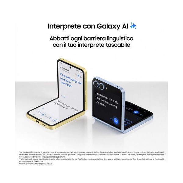 Abbatti le bariere linguistiche in un attimo grazie a Interprete su FlexWindow: Galaxy AI trascrive le conversazioni in tempo reale e le traduzioni in lingua appaiono come testi sul display esterno del tuo Galaxy Z Flip6.