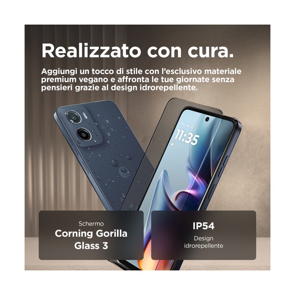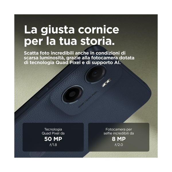 Foto più nitide per storie straordinarie. Goditi immagini e audio mozzafiato con il nuovo Moto g05. Guarda i tuoi spettacoli e film preferiti su uno schermo sorprendentemente luminoso da 6,67" anche all'aperto sotto la luce del sole. E ascolta un audio avvolgente grazie ai potenti altoparlanti stereo con Amplificazione bassi. Scatta foto straordinariamente nitide sia di giorno che di notte con il sistema di fotocamera Quad Pixel da 50 MP(2) dotato di funzionalità Ritratto basata sull'AI. Incrementa la tua velocità con performance ultra-efficienti e fino a 12 GB di RAM disponibili con Estensione RAM(5). Grazie a una finitura in materiale premium vegano(4) e a Corning® Gorilla® Glass 3, Moto g05 regala uno stile intramontabile. Conta sulla straordinaria autonomia offerta dalla batteria da 5200 mAh e sulla ricarica TurboPower™. E ottieni tantissimo spazio di archiviazione per conservare i tuoi contenuti e le tue creazioni. Moto g05 è sorprendente sotto ogni aspetto.
