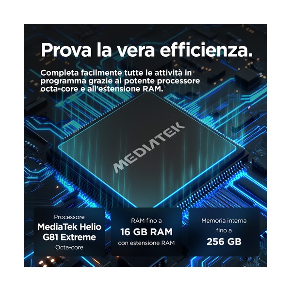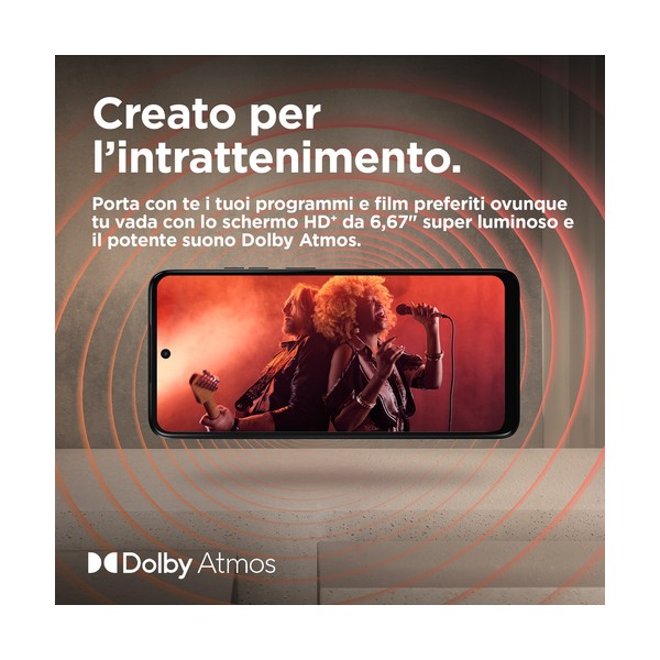Foto più nitide per storie straordinarie. Goditi immagini e audio mozzafiato con il nuovo Moto g05. Guarda i tuoi spettacoli e film preferiti su uno schermo sorprendentemente luminoso da 6,67" anche all'aperto sotto la luce del sole. E ascolta un audio avvolgente grazie ai potenti altoparlanti stereo con Amplificazione bassi. Scatta foto straordinariamente nitide sia di giorno che di notte con il sistema di fotocamera Quad Pixel da 50 MP(2) dotato di funzionalità Ritratto basata sull'AI. Incrementa la tua velocità con performance ultra-efficienti e fino a 12 GB di RAM disponibili con Estensione RAM(5). Grazie a una finitura in materiale premium vegano(4) e a Corning® Gorilla® Glass 3, Moto g05 regala uno stile intramontabile. Conta sulla straordinaria autonomia offerta dalla batteria da 5200 mAh e sulla ricarica TurboPower™. E ottieni tantissimo spazio di archiviazione per conservare i tuoi contenuti e le tue creazioni. Moto g05 è sorprendente sotto ogni aspetto.